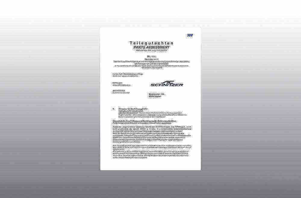 Here you can find the complete Warranty Conditions. Homologation Certificate The parts homologation certificate is an official document which allows the use of tuning parts in public road traffic within the framework of the (StVZO) German road traffic licensing regulations (and some other countries). After installation or conversion of the part described in the certificate, the vehicle must be presented to an official inspection body. The inspector determines the correct installation and the authenticity of the part and subsequently enters the modification in the vehicle documents. The official operating license of the vehicle thus remains in force. The parts homologation certificate is part of the scope of delivery.